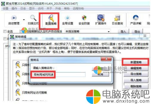 6、安装并运行“聚生网管”程序,在其主界面中点击“配置策略”按钮,从弹出的窗口中创建一个名为“限制局域网网速”的新策略。