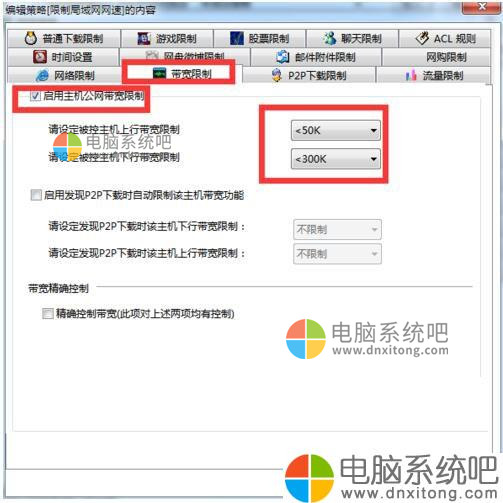 7、从打开的“编辑策略”界面中,切换到“宽带控制”选项卡,勾选“启用主机公网宽带控制”选项,同时设置“上行带宽”和“下行带宽”,点击“确定”完成设置。