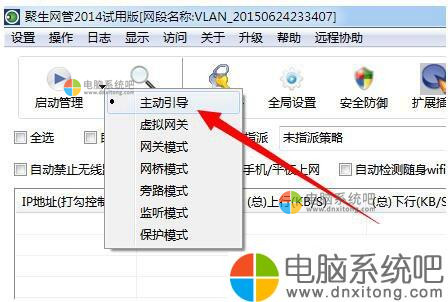 8、点击“启用监控”右侧的下拉按钮,从中选择“主动引导”模式,同时点击“启用监控”按钮以列出当前局域网中所有主机。