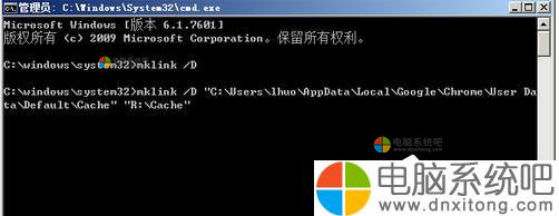 第五步:在弹出的命令行窗口输入 : mklink /D “C:\Users\登录用户名\AppData\Local\Google\Chrome\User Data\Default\Cache” “R:\Cache”