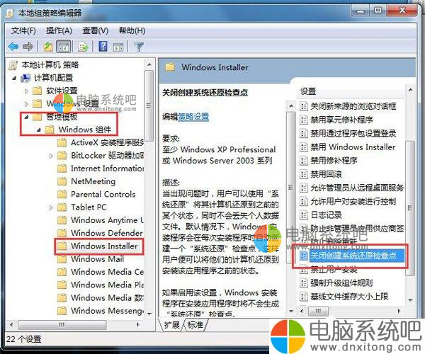 2、运行gpedit.msc组策略里,计算机配置–管理模板–windows组件–windowsInstaller–启用关闭创建电脑系统还原检查点。