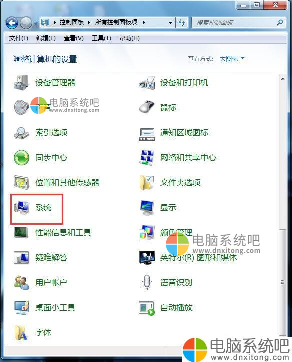 2、在“控制面板”中以“大图标”的方式查看窗口内容,然后选择“调整计算机的设置”中的“电脑系统”选项。