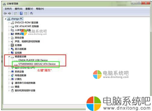 4、打开“设备管理器”窗口,然后双击“磁盘驱动器”设备,展开驱动程序,在展开的设备中,单击右键。选择“属性”命令。