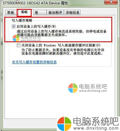 5、在弹出的硬盘属性对话框中,切换到“策略”选项卡,然后选中“启用设备上的写入缓存”复选框,然后单击“确定”按钮。