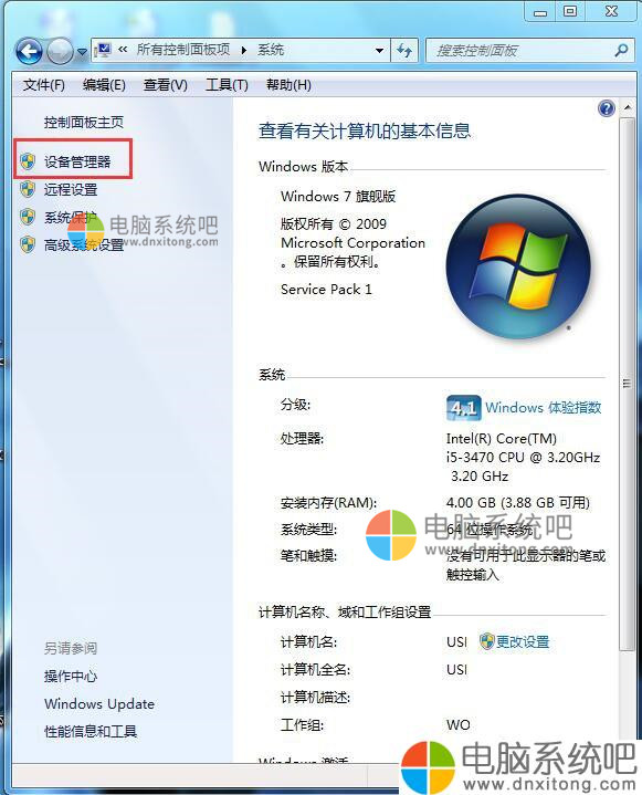 3、打开“电脑系统”窗口,然后在“控制面板主页”区域中单击“设备管理器”链接。