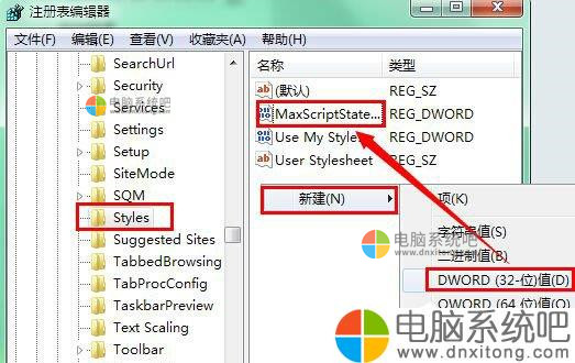 4、然后选中“Styles”项,在右侧窗口中新建DWORD(32-位)值,并将新建的项目命名为MaxScriptStatements。