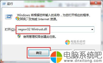 3、重新打开运行窗口,在运行窗口中输入“regsvr32 Wintrust.dll”回车确认进入下一步操作。如下图所示: