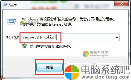 4、再次打开运行窗口,在运行窗口中输入“regsvr32 Initpki.dll”回车确认,点击确定完成操作。如下图所示: