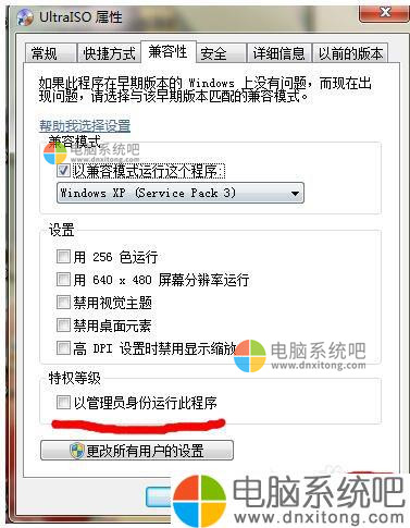 3、在面板中找到兼容性,然后勾选掉以兼容方式运行程序,同时也可以选择下面的以管理员身份运行程序。设置完成之后确认应用就ok了。