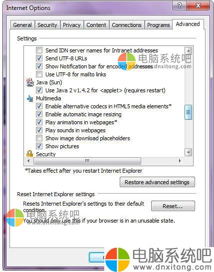 6、如果不愿意使用360安全卫士,也可以手动修改配置。针对IE浏览器,打开:工具-Internet选项-高级-多媒体-显示图片,把显示图片勾上就可以了。然后重启浏览器。
