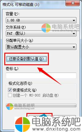 2.在对U盘执行格式化操作时,在弹出的“格式化可移动磁盘”窗口中,点击“还原设备的默认值”按钮,然后点击“开始”按钮尝试格式化U盘。