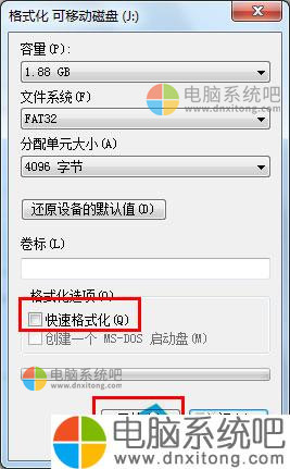 3.选择“低级格式化”U盘。在打开的“格式化 可移动磁盘”窗口中,取消勾选“快速格式化”项,然后点击“开始”按钮尝试格式化U盘。