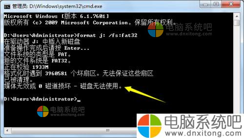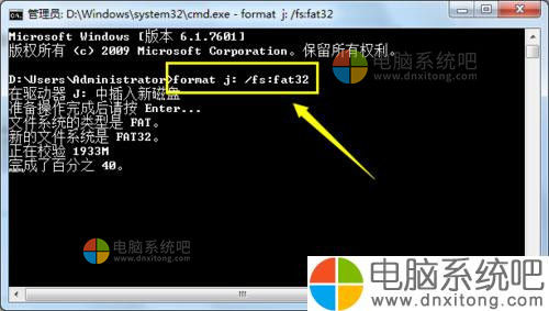 2.接着输入“format j: /fs:fat32”(其中j代表U盘所在盘符)并按回车键执行U盘格式化操作。