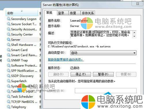 4、在服务器设置找到Server,双击Server [启动类型]选为[自动],[服务状态]为[已启动]。