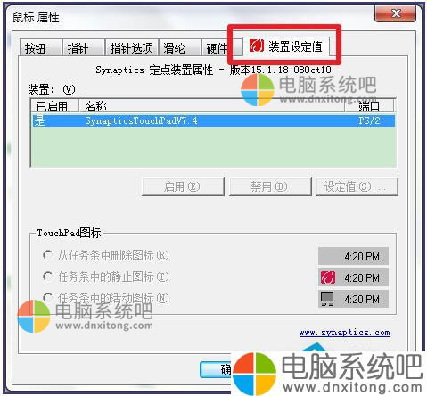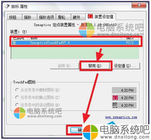 4、点击装置,然后点击【禁用】,再点击【确定】,也可以关闭触摸板。