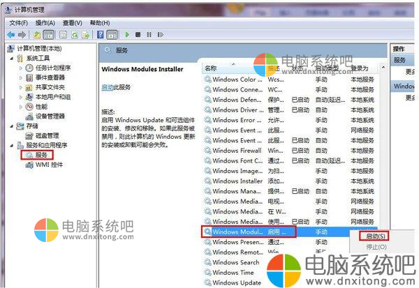 计算机右击管理,打开服务,检查Windows Modules Installer服务是否开启,如果服务状态为停止,则启用此服务。