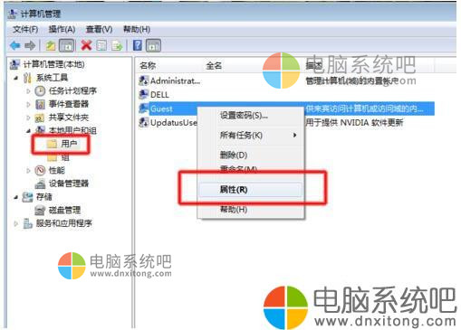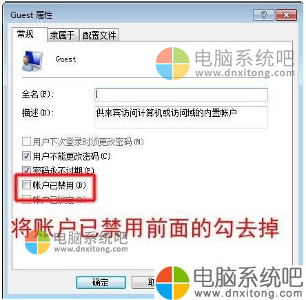 4、我们右键“Guest”属性→在弹出的对话框中将“账户已禁用”前面的勾去掉。