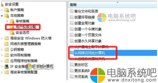 7、我们选择“本地策略”→“用户权限分配”→“从网络访问此计算机”。