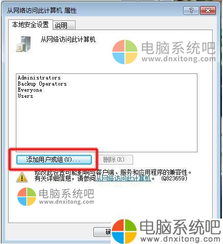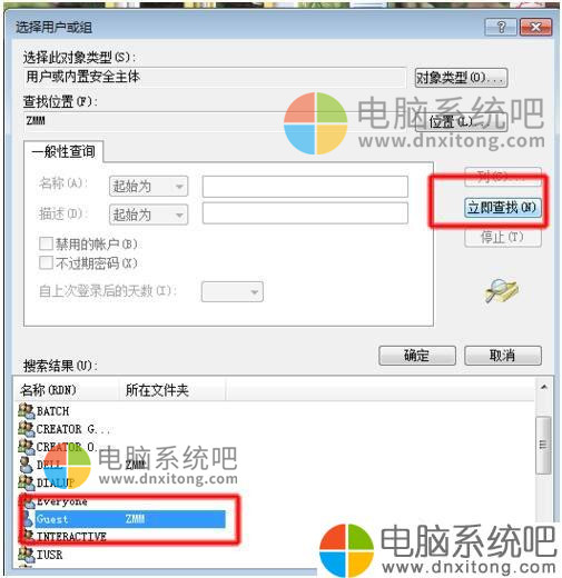 8、在弹出的“从网络访问此计算机”的对话框中添加Guest用户(方法为:添加用户或组→高级→立即查找→Guest→确定即可。)