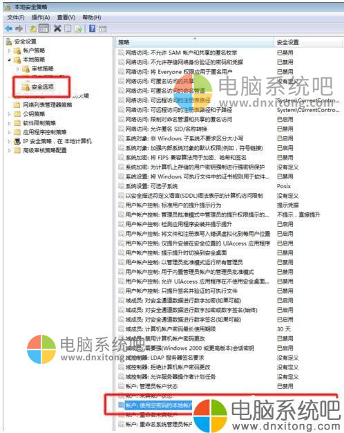 4、解决方法:我们打开“控制面板”→“管理工具”→“本地安全策略”→“本地策略”→“安全选项”→“账户:使用空密码的本地账户只允许控制台访问”。