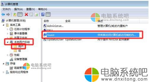 3、在弹出的对话框中选择“本地用户和组”→“用户”→“Guest”。