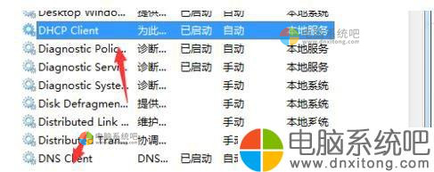 5、找到DNS Client和DHCP Client服务,点击打开,选择自动,启动服务。
