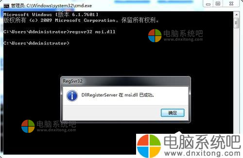 2、然后在输入regsvr32 msi.dll 注意空格! 然后按下回车,提示注册成功即可!!入下图所示!!