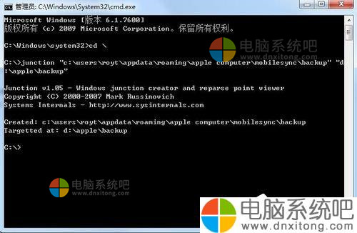 junction “C:\Users\(你的用户账户名)\AppData\Roaming\Apple Computer\MobileSync\Backup” “D:\Apple\Backup”