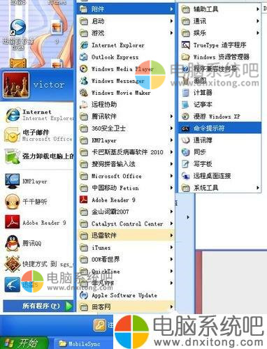 XP:点“开始”→“所有程序”→“附件”→“命令提示符”或者在“运行”中输入cmd,然后输入下图所示命令“每个空行一个回车”