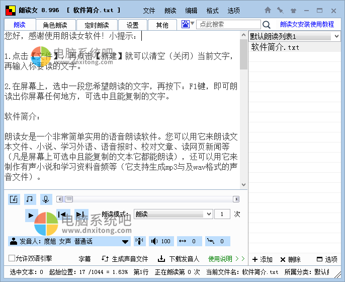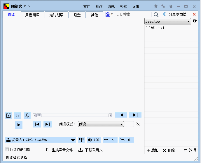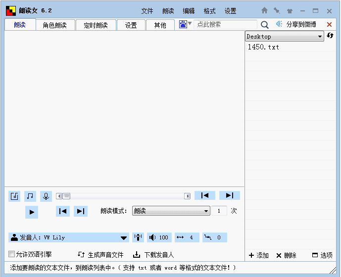 朗读女是一个非常简单实用的语音朗读软件。您可以用它来朗读文本文件、小说、学习外语、语音报时、校对文章、读网页新闻等(凡是屏幕上可选中且能复制的文本它都能朗读),还可以用它来制作有声小说和学习资料音频等(它支持生成mp3与及wav格式的声音文件)。