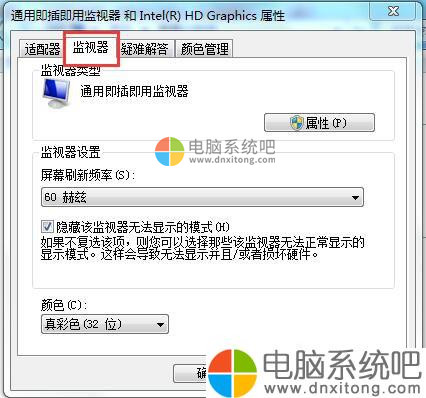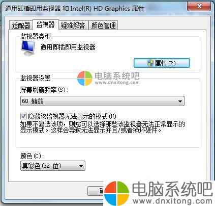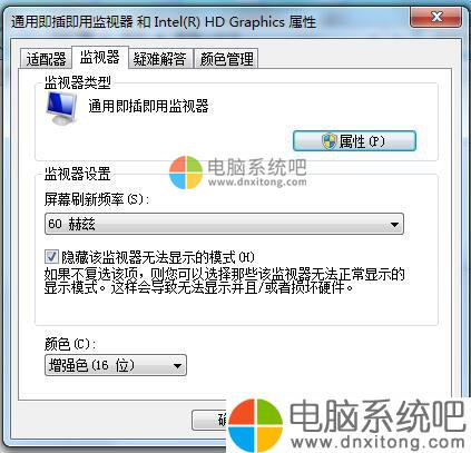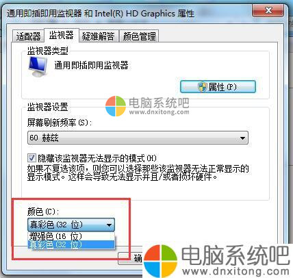 3、把颜色选项中的“真彩色(32位)”改为“增强色(16位)”,点击应用。注意,点击完应用之后,所有的边框的颜色都会改变,变成不透明的,不过不用怕,再点击确定即可。