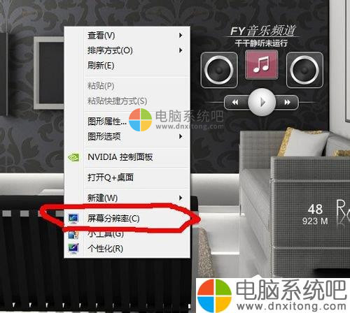 1、在电脑的桌面空白处,鼠标单击右键,在弹出的列表中选择“屏幕分辨率”。