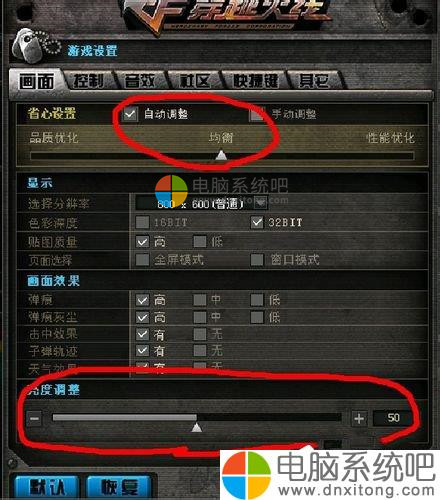 5、现在,可以登录上穿越火线,点击游戏设置,设置如下图所示,亮度不用调太光,效果会不佳的,亮度调整为50左右即可。